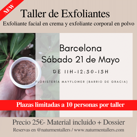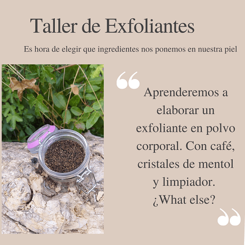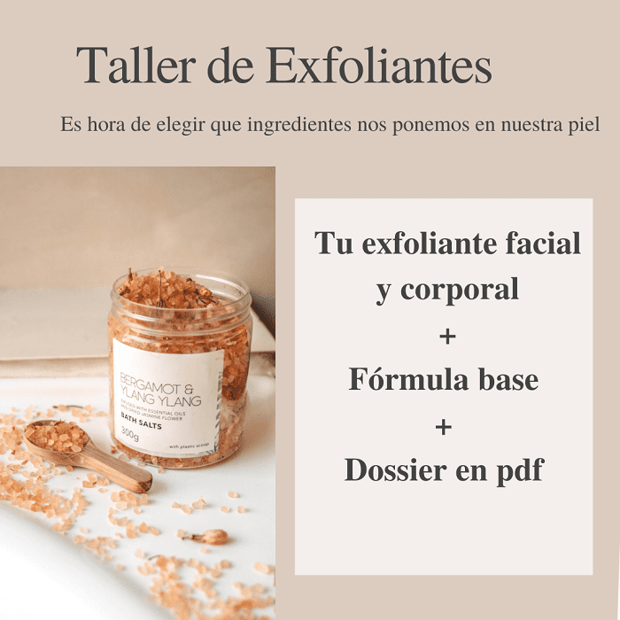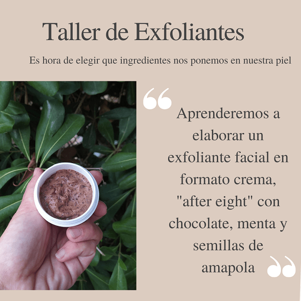 Es un taller creativo y práctico, con una parte de teoría, donde se explica que tipos de activos e ingredientes podemos emplear para la elaboración de exfoliantes mecánicos y ponemos en práctica dos formatos distintos.