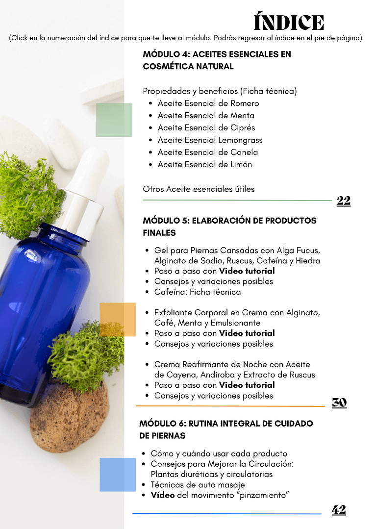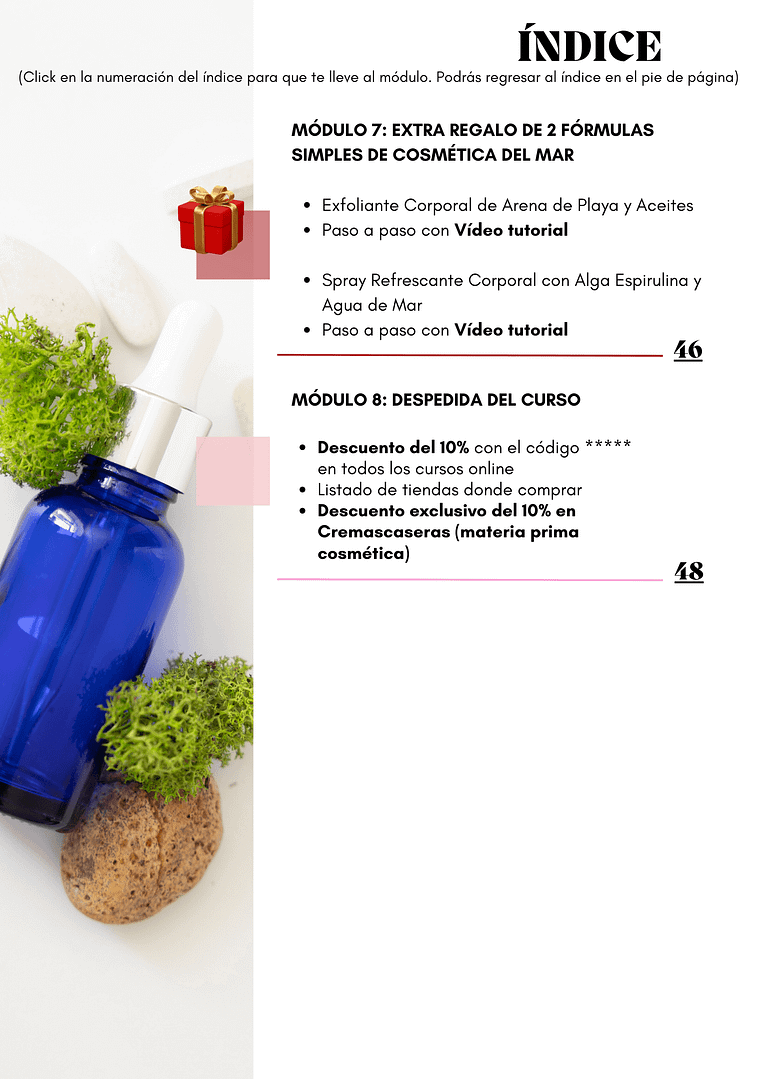 Es un curso excepcional, me llamó mucho la atención el uso de algas en la cosmética y por eso lo compré, pero cuando entiendes las propiedades que tienen para tu salud de la piel y el cuerpo pasas a otro nivel. Las elaboraciones son sencillas . Me encanta!