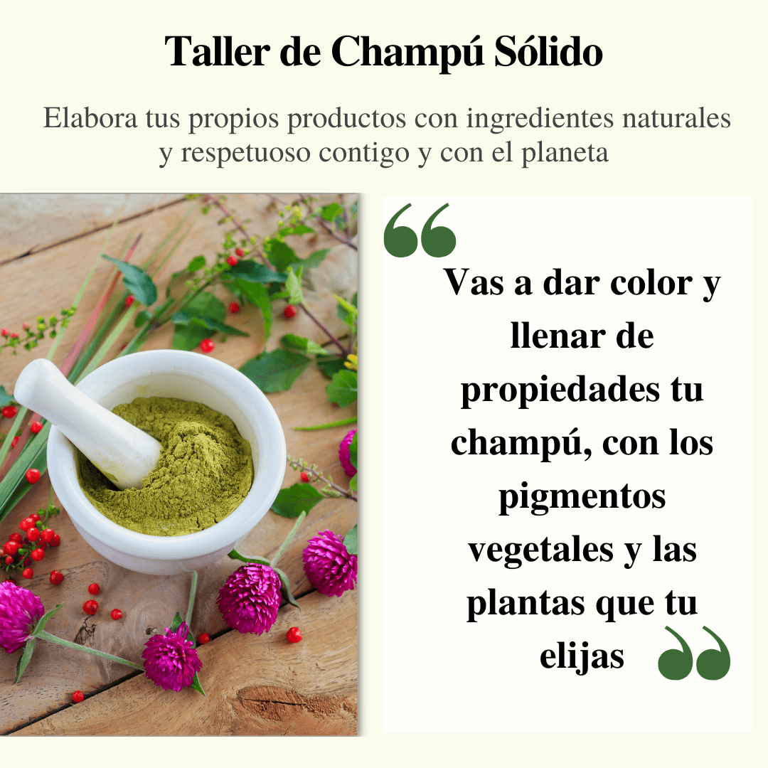 Este taller no solo es una experiencia creativa; es una inversión en ti y en el planeta. Aprenderás a tomar el control de lo que usas en tu cabello, a reducir tu impacto ambiental y a disfrutar de una alternativa natural que realmente funciona.